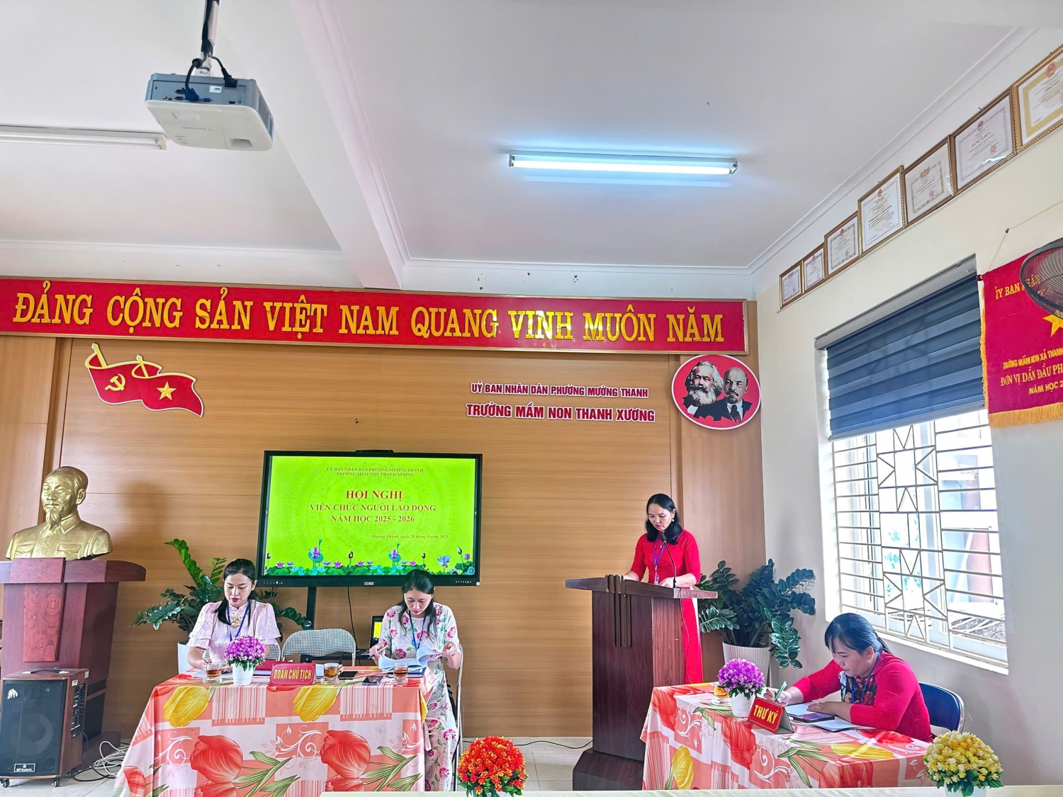 Thực hiện Quy chế dân chủ nhằm phát huy tinh thần trách nhiệm của đội ngũ viên chức, người lao động trong việc xây dựng chương trình, kế hoạch năm học, tạo sự đồng thuận cao góp phần hoàn thành thắng lợi nhiệm vụ năm học, ngày 20 tháng 9 năm 2025, trường Mầm non Thanh Xương tổ chức Hội nghị viên chức, người lao động năm học 2025 – 2026. Hội nghị là hoạt động chính trị để tập thể viên chức, người lao động trong đơn vị có sự đánh giá, rút kinh nghiệm, khái quát hóa kết quả đã đạt được trong năm học 2024–2025, đồng thời thảo luận, thống nhất phương hướng, nhiệm vụ và các giải pháp trọng tâm năm học 2025–2026.